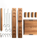 - One (1) 13.75-in x 7-in x 13.75-in target, andand four (4) score keepers made from solid Acacia Wood