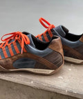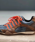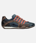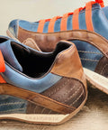 Monza-Indigo is one of our best sellers – Deep indigo blue with orange contrast stripes. Dark cognac accents the sides of the shoes, with a slightly darker espresso gracing the heel. A color combination that is classic yet stands out.