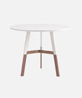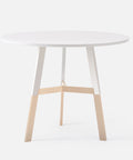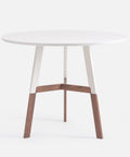 The 1/2 Nelson is a modern take on a classic café table. It boasts a durable powder coated top, with matching leg sleeves, and a handcrafted maple/walnut base. The base is tied together with a unique pinwheel joint.