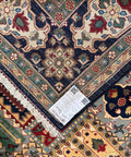 From the images, its palette showcases deep navy blue, rich forest green, warm pistachio, and soft ivory accents, arranged to create depth and contrast across the symmetrical grid. These tones not only highlight the craftsmanship but also make the rug versatile for a variety of interiors.