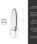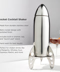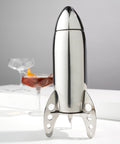 Sleek and space-worthy, our retro rocket cocktail shaker holds 24 ounces and includes a strainer, lid, capsule-esque cap, aerodynamic body, and launch-ready shaker stand.