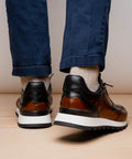 European style dress sneaker stitched up in a comfortable mix of black and cognac patterns.