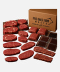 Secure your slice of the steer. This curated 1/8 share delivers our best steak cuts, everyday go-to’s, and high-protein snacks—raised right here at Five Oaks Farm, grain-finished for deep marbling, and shipped frozen to your door.