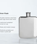 Polished to a brilliant silver, this high-shine stainless steel flask is liquid-tight and crowned with a weighty, equally lustrous cap to hold any desired liquor.