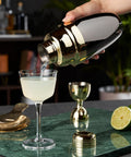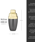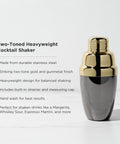 Our heavyweight cobbler shaker is a carefully crafted matter of heft, balance and contour that ensures stability and momentum while shaking drinks. Designed exclusively by professionals for professionals, this substantial two-tone gold and gunmetal tool is the cornerstone of any professional bar set.